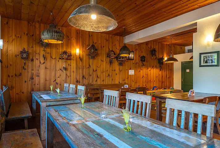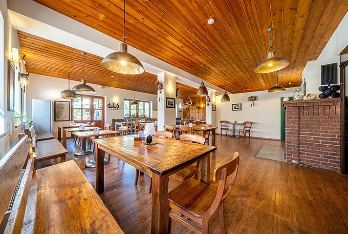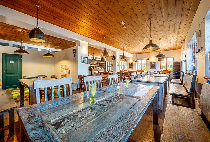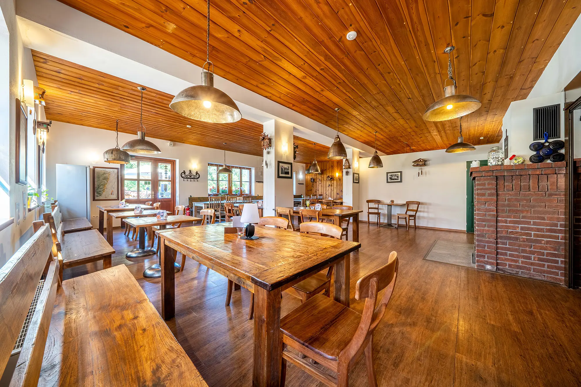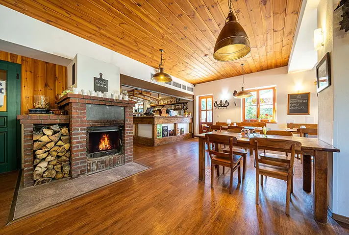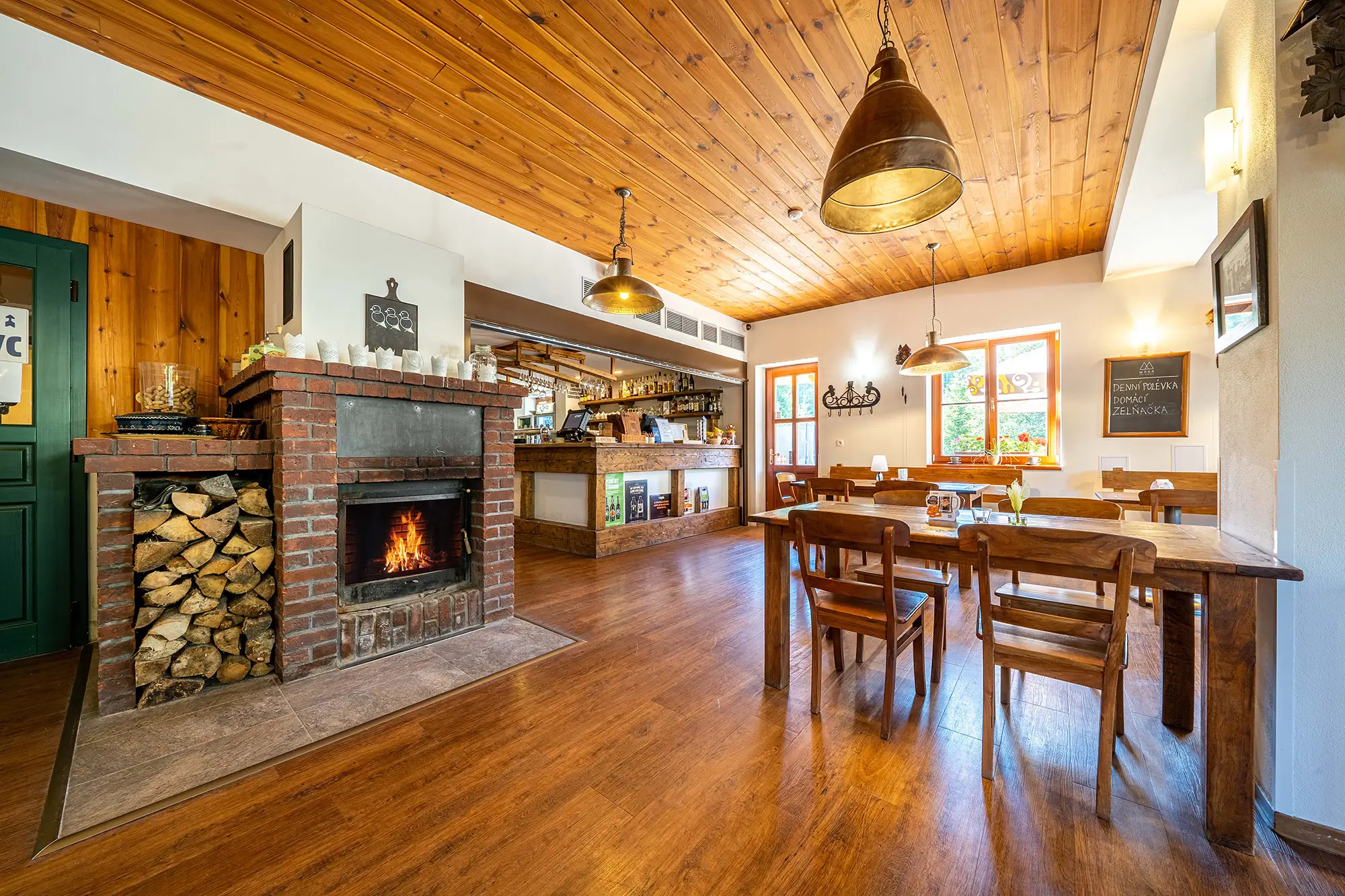 A spacious restaurant with a cozy interior, a fireplace and a countryside Bohemian forest style. It is ideal as a comfortable spot for both families and groups of guests.